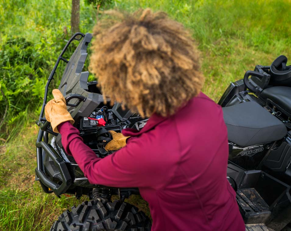 3 modes de conduite : Standard / Travail / Performance, Prise électrique 12 volts, port de charge lente intégré, pré-câblé pour chauffe-mains et chauffe-pouces, système de sécurité activé par code PIN, Treuil de 1 587kg (3 500 lb) avec corde synthétique et NOUVEAU système d'arrêt automatique, Rallonge de porte-bagages avant, benne basculante, protections de bras triangulaires avant et arrière, plastiques peints
